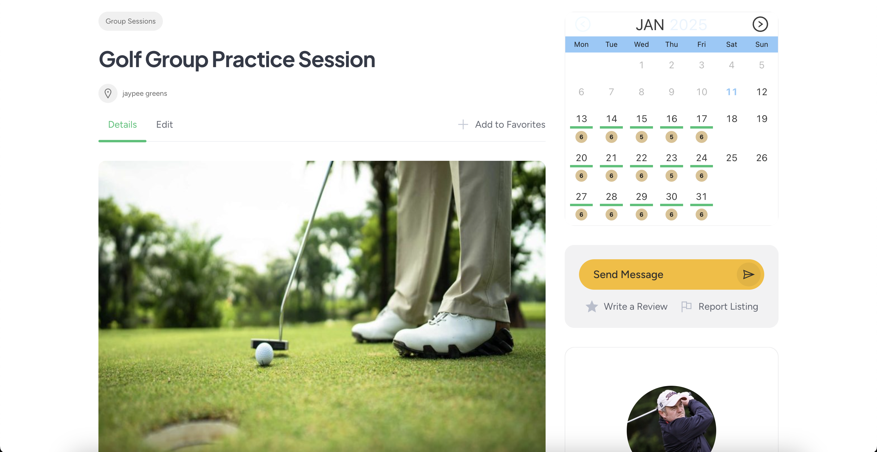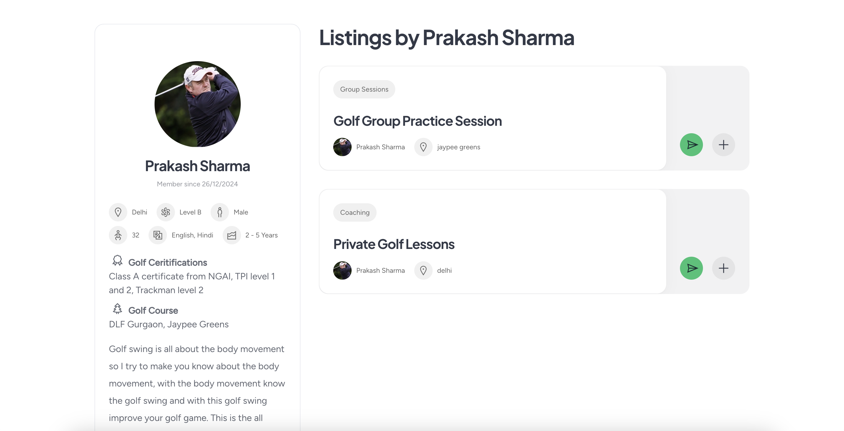 एक समर्पित गोल्फ़ कोच होने के नाते, आप उन खिलाड़ियों से जुड़ने के महत्व को समझते हैं जो अपने कौशल को निखारने के लिए उत्सुक हैं। हमारा अभिनव प्लेटफ़ॉर्म ख़ास तौर पर आप जैसे कोचों के लिए डिज़ाइन किया गया है, जो आपकी सेवाओं को सूचीबद्ध करने और ज़्यादा ग्राहकों को आकर्षित करने का एक सहज तरीका प्रदान करता है।